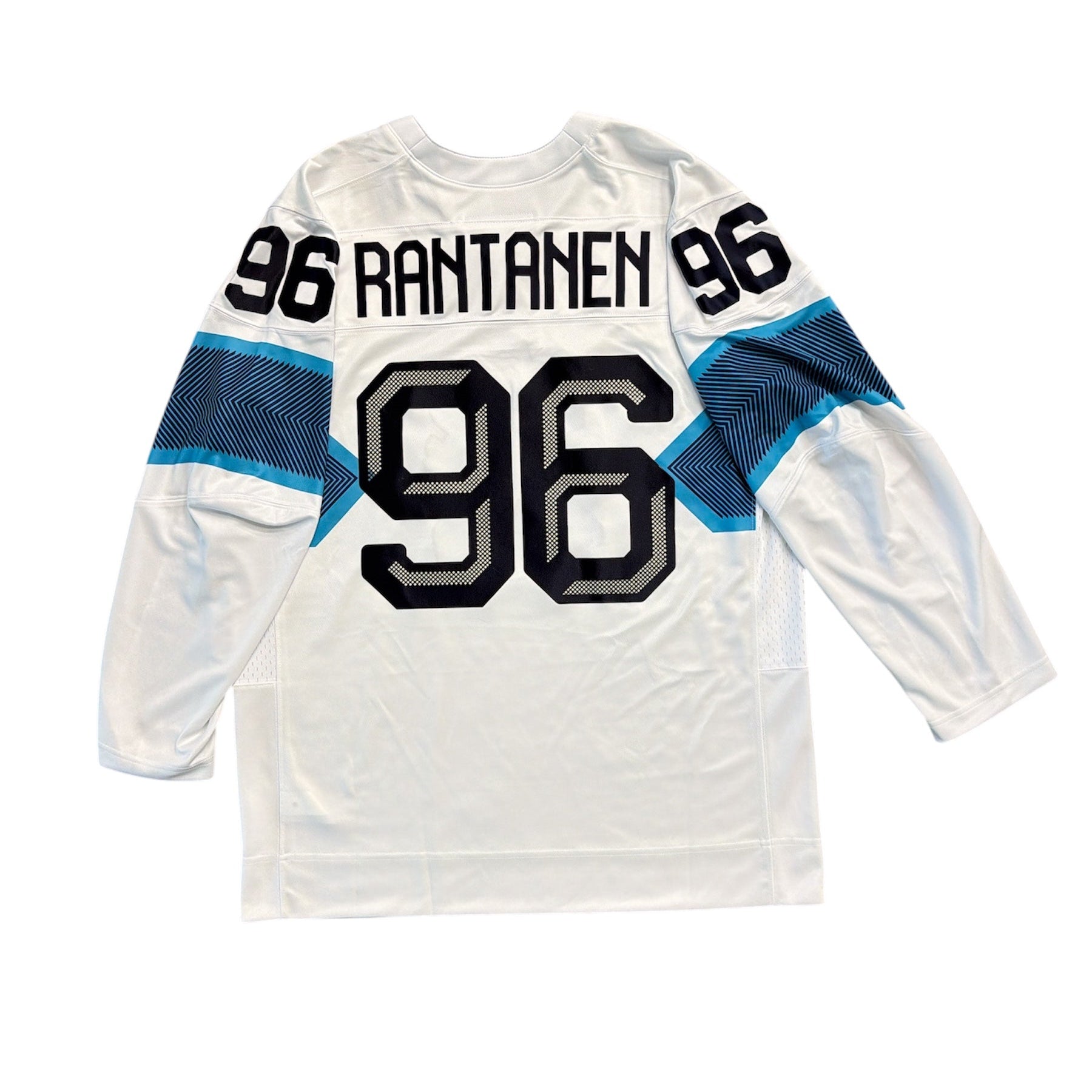 White hockey jersey with '96 Rantanen' printed on a white background